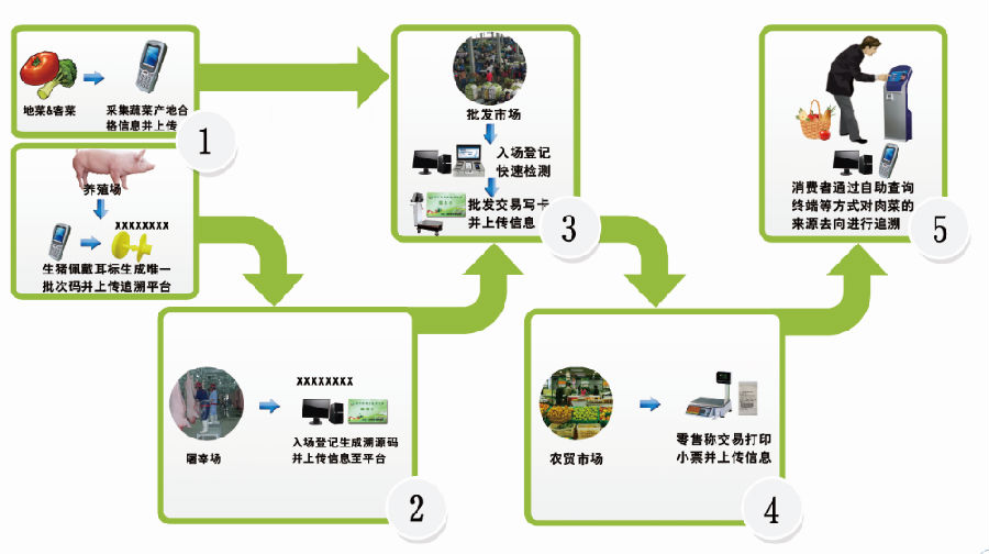 肉类蔬菜流通追溯体系是一个以中央和城市追溯管理平台为核心,以屠宰企业、批发市场、零售市场、团体采购单位和“产销对接”核心企业追溯子系统为支撑,以信息链条完整性管理为重点,旨在实现肉类蔬菜流通信息全过程、全方位、全覆盖的正向监管和逆向追溯。